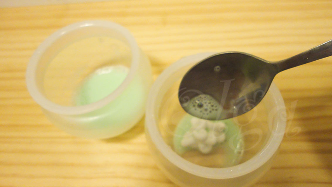 La pintura va tardar un ratito en secarse, pero muy poco, así que hay que darse prisa y rápidamente preparar el segundo color para que al caer se mezclen entre si. El proceso es el mismo, hacemos la mezcla de color, añadimos el agua con lavavajillas y almidón , y con el gotero dejamos caer la pintura.