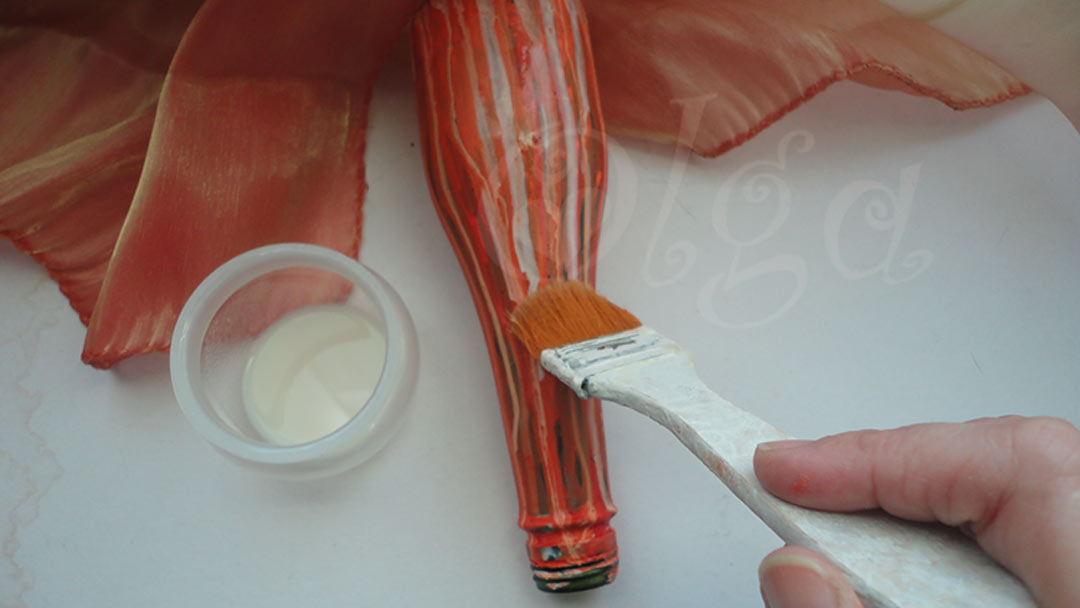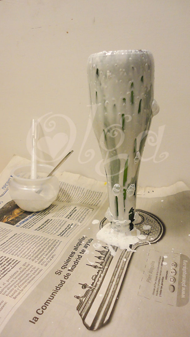 Y ahora preparate a pringarlo todo! Pon la botella boca abajo. Yo para que se sujetase bien le he puesto un pegote de plasti en la boca.